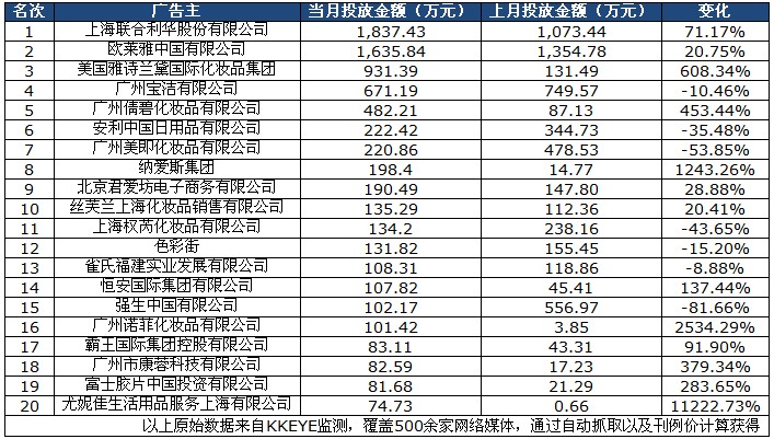 化妆及卫生用品行业品牌网络广告投放TOP20广告主如下表所示,联合利华、欧莱雅和雅诗兰黛占据了前三名的位置。