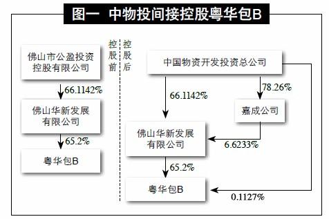 中物投从佛山市公盈投资控股有限公司受让佛山华新发展有限公司(以下简称:华新发展)62.1142%国有法人股,其控股子公司嘉成企业发展有限公司持有华新发展6.6233%股份,收购完成后,中物投直接持有粤华包B 0.1127%的股份,同时成为华新发展的控股股东。其中华新发展持有粤华包B 65.2%股份,因而中物投间接持有粤华包B 65.2%股份,成为粤华包B的实际控制人(如图一)。
