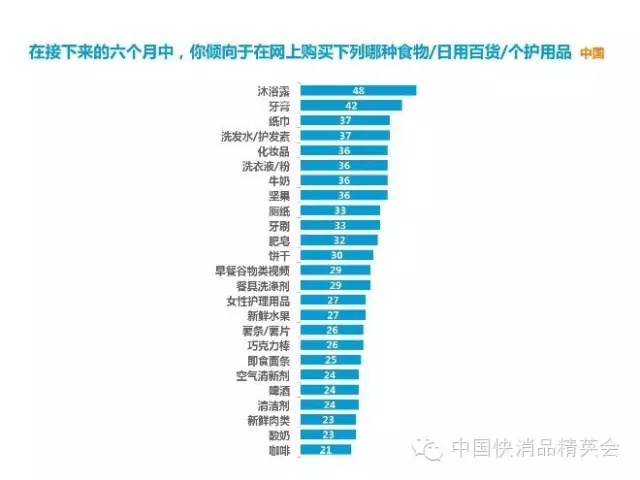 尼尔森的数据显示,实体商铺毫无疑问地在食品饮料类以62%的销售额占据了头名,食品杂货店以32%的份额紧随其后,而线上交易则占了6%。但调查同时显示,食品饮料类商品在线上交易蕴藏着巨大的增长潜力,约36%的中国受访者表示,在未来的6个月内,他们计划在线上购买牛奶和坚果产品,超过20%的人则表示会在网上购买啤酒、酸奶和咖啡。另外,在2013-2014年间,液态奶和巧克力的线上销售分别上涨91%和59%。