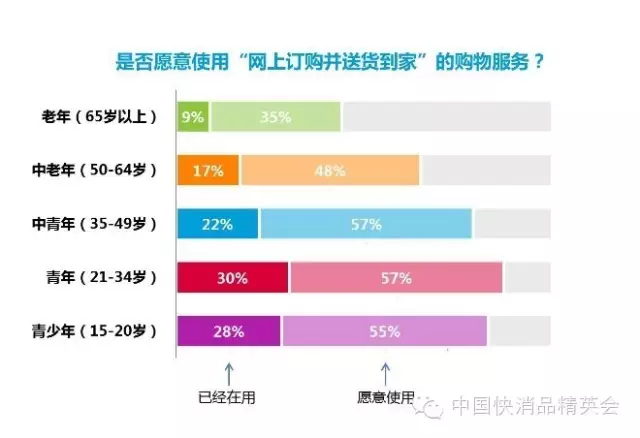 伴随着数字技术成长起来的15-34岁的年轻人是线上消费的主力军。这些消费者热衷并精通新技术,据调查,21-34岁的青年群体对线上消费的需求不仅推动了线上销售的增长,还促使这一产业日趋成熟。在全球范围内,80后、90后甚至00后的年轻人都是网上购物的主力军,中国也不例外。这些消费者对数字技术的使用有着空前的热情,线上购物对他们而言不仅是一个习惯,而且逐渐成为了一种新的生活方式。当下,被普遍使用的6种线上购物形式,即网络购物送货上门、网络订购店内自取、开车经过取货、指定站点取货、虚拟超市和自动定制,最受年轻消费者的欢迎,他们也是未来最希望完全使用网上购物的一代人。调查显示,9%的老年人、17%的中老年、22%的中青年、30%的青年群体、28%的青少年已经使用了网络购物送货上门的服务形式。其中,年轻受访者表示他们未来愿意使用各种线上购物方式。