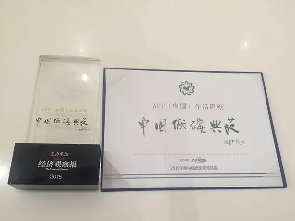 2015年6月30日,由《经济观察报》主办的“2015年度中国低碳典范评选”活动在北京隆重召开。工业和信息化部原材料工业司司长周长益先生也出席了颁奖典礼。APP(中国)旗下生活用纸作为世界领先的绿色造纸企业荣获“2015年度中国低碳典范”称号,APP(中国)也是此次造纸行业中唯一的获奖企业。
