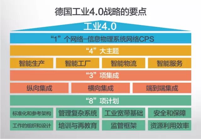 德国政府所定义的德国工业4.0,由一个信息、一个网络、四大主题、三项集成、八项计划组成的框架机构。德国政府提出工业4.0整体框架有很多地方和中国的实际国情不同,操作上面还有一定的距离。