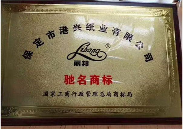根据国家工商总局商标局2015年年中对河北省工商行政管理局“关于认定‘丽邦Libang’商标为驰名商标的批复”,保定市港兴纸业有限责任公司使用在商标注册用商品和服务国际分类第16类卫生纸商品上的“丽邦Libang”注册商标被认定为驰名商标。