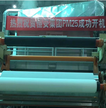 恒安纸业(昌吉)有限公司一期项目第一台纸机于11月12 日成功开机出纸。该机幅宽2850mm,设计车速1600m/min,采用商品木浆原料生产高档生活用纸,年产能可达2.5万吨。