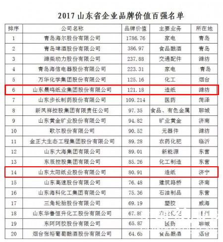 晨鸣、太阳纸业上榜“2017山东省企业品牌价值百强”名单