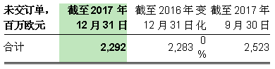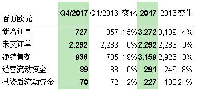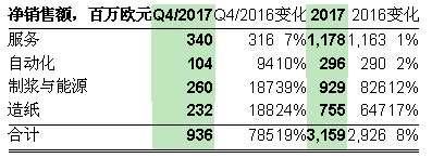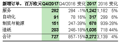 “2017年,公司新增订单增加1.32亿欧元,至33亿欧元。造纸市场异常活跃,新增订单增长40%以上,超过10亿欧元。稳定业务(服务与自动化)的新增订单亦呈增长态势。2017年,稳定业务新增订单增长6%,至16亿欧元,几乎占整个新增订单的一半。”
