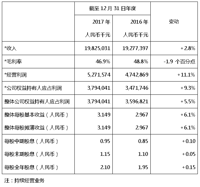 3月22日,恒安国际公布截至2017年12月31日的全年业绩。2017年,恒安国际持续经营业务实现收入198.25亿元,同比增加2.8%;经营利润52.72亿元,同比增加11.1%;公司权益持有人应占利润37.94亿元,同比增加9.3%。