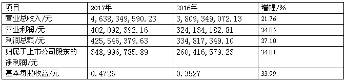 2017年,中顺洁柔的营业收入为46.38亿元,比2016年增长21.76%,主要是项目建设完成、产能提升、销售团队积极开拓市场、搭建网络平台和优化产品结构所致。2017年归属于上市公司股东的净利润为3.49亿元,比2016年增长34.01%;营业利润较2016年上升24.05%;利润总额较2016年上升27.10%;基本每股收益较2016年上升33.99%。中顺洁柔2017年业务增长的主要原因是产能有效释放和渠道建设的进一步完善,带动了销售额的增加。