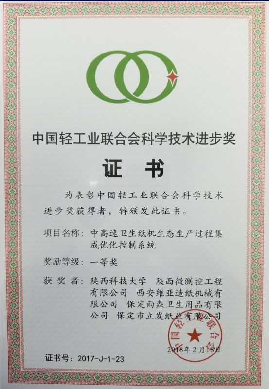 3月20日,中轻联四届四次、总社七届八次理事会暨总社成立60周年大会及科学技术奖颁奖大会在山西太原隆重举行。由陕西科技大学、陕西微测控工程有限公司及保定雨森卫生用品有限公司等五家单位联合申报的科研成果“中高速卫生纸机生态生产过程集成优化控制系统”荣获中国轻工业联合会科学技术进步一等奖。