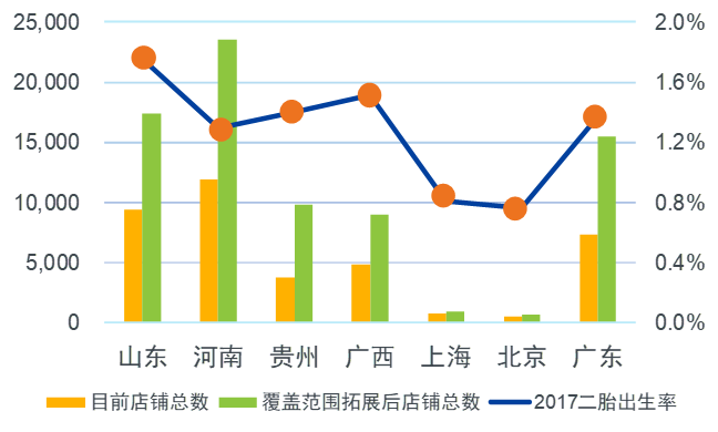 在拓展覆盖范围后,尼尔森发现,母婴店增长最多的省份并非最大的省份。例如新生儿数量最大/出生率最高的省份是山东省,母婴店最多的省份是河南省,而增量比例最高的却是贵州省。以广西和贵州为例,母婴店在其整体零售店的占比明显高于上北广等一线城市。另外,从近三年的出生率也可以发现,广西贵州的新生婴儿出生率同样高于北京上海这类一线城市。而在这次的尼尔森零售研究指数升级中,广西和贵州预期的母婴总店数增长率也比北京和上海增加更多,分别是86%和161%,而北京、上海的预计母婴店数增长率仅为46%和20%。由此可见,三四线城市母婴店的市场更加广阔,将会是未来的增长引擎。