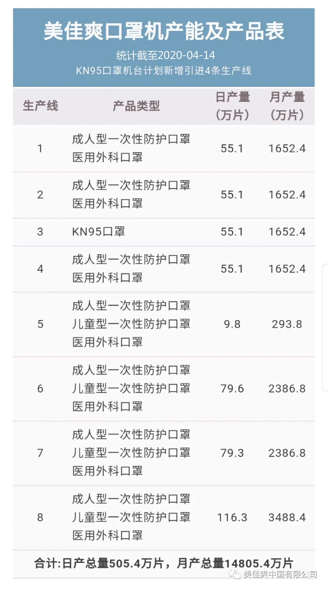 自2020年2月初以来,美佳爽在市政府的支持下,共同商讨疫情处理与应对方法,积极响应生产防疫物资的需求,采取一系列有效措施,克服生产线改造、复工难、原材料供应的难题,全力以赴、不计代价地投入生产活动,携手共同打赢疫情防控阻击战。实现从供应国内需求到产品出口,从无到一次性防护口罩,再到儿童防护口罩,再到医用外科口罩及KN95口罩的产品线的升级和完善,产能实现日均500万口罩的突破,达到产能和质量不断追求卓越的目标。 当前,美佳爽共有8条口罩生产线,包括成人一次性防护口罩、儿童一次性防护型口罩及医用外科口罩。据悉,美佳爽(中国)有限公司目前将改造KN95口罩机,并且计划新引进多条KN95口罩产线,以生产出更符合人们防护需求的口罩。
