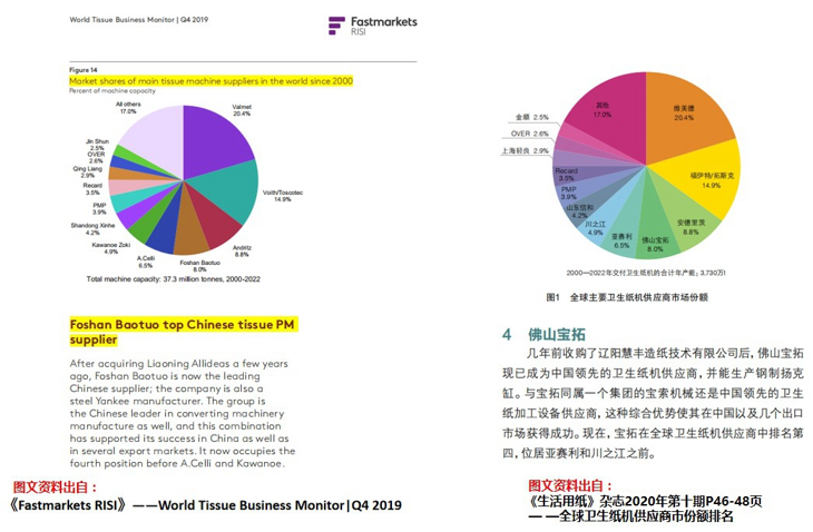 近期,造纸行业数据分析领军者《Fastmarkets RISI》公布的数据中,2000-2022年全球交付卫生纸机的合计年产量是3730万t,在全球主要卫生纸机供应商内,佛山宝拓以8.0%的市场份额,仅次于维美德、福伊特、安德里茨,排名全球第四,中国第一!